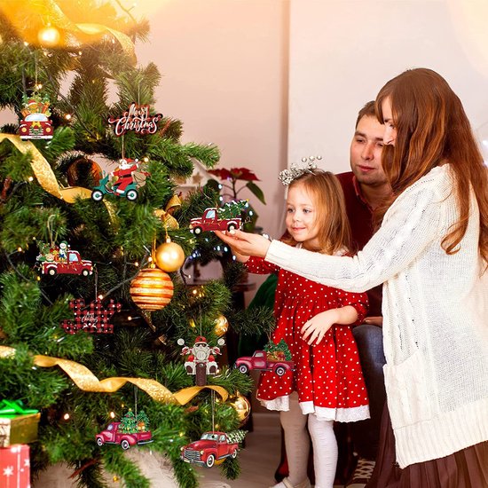 Deze unieke set kerstdecoraties bestaat uit 24 prachtige rode vrachtwagens, elk met een eigen, gedetailleerd ontwerp. De decoraties zijn gemaakt van stevig hout en voorzien van feestelijke accenten zoals kerstbomen, cadeautjes, sneeuwpoppen, en zelfs een vrolijke kerstman op een scooter. Perfect om je kerstboom, woonkamer of cadeaus mee te versieren en een warme, nostalgische sfeer te creëren.