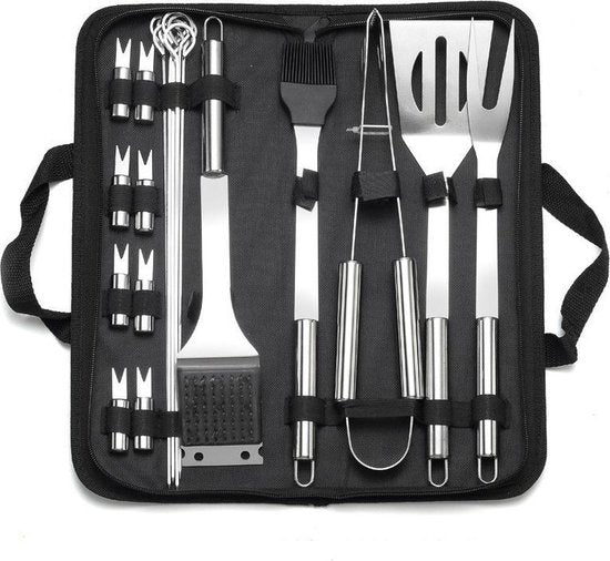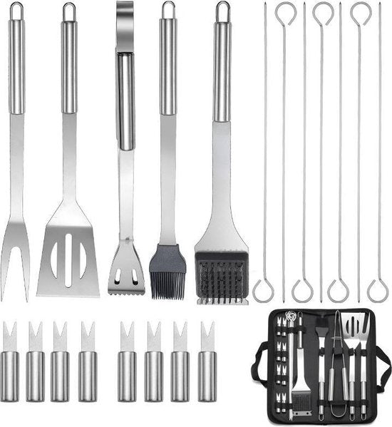 Deze BBQ-gereedschapsset bevat een grillvork, grillspatel, grillclip, grillborstel, 7 kebabs, 8 maïsrekken, grillreinigingsborstel en opbergtas. Een complete roestvrijstalen grilltoolkit van hoge kwaliteit heeft alles wat je nodig hebt om je gerechten aan te vullen en het grillen gemakkelijker te maken.