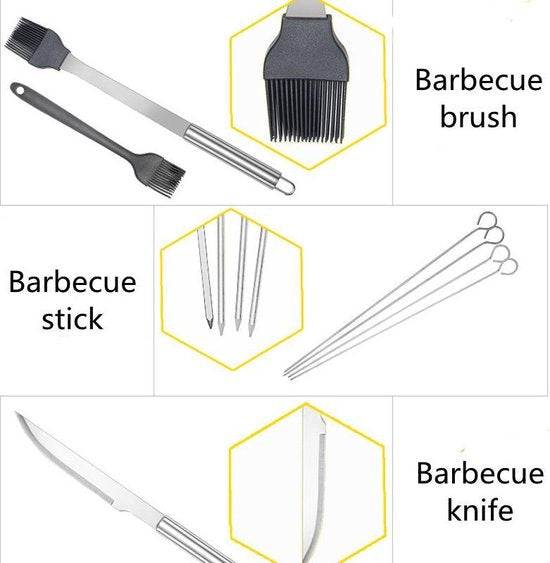 BBQ schoonmaakborstel: Nadat u klaar bent met bakken en iedereens buik weer vol is, blijf je altijd zitten met de schoonmaak van de barbecue. Deze set bevat een schoonmaakborstel waarmee de grill er binnen de kortste keren weer uitziet als nieuw.