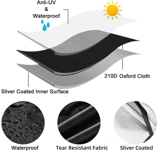 - 210D Oxford polyester met zilvercoating – vermindert UV-schade en temperatuureffecten, waardoor kunststof en verf langer behouden blijven.