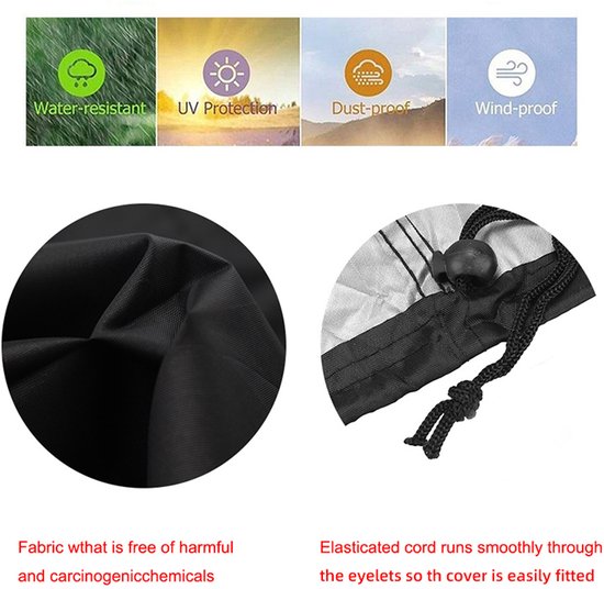 - Elastisch trekkoord en sluitclips – zorgt voor een stevige pasvorm rond dissel en steunwiel, voorkomt loswaaien bij wind.