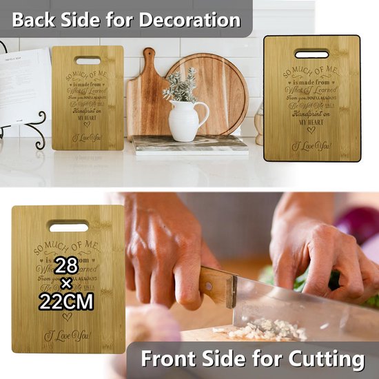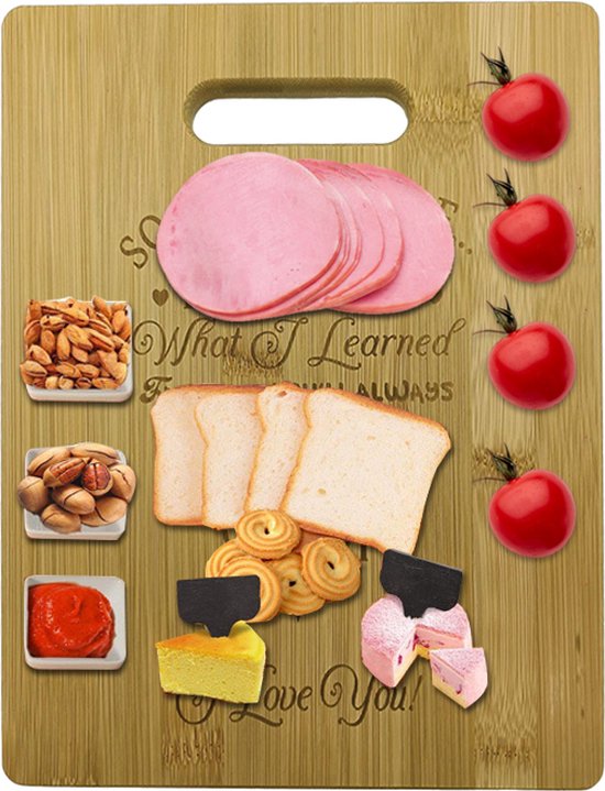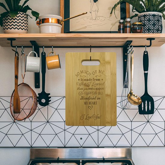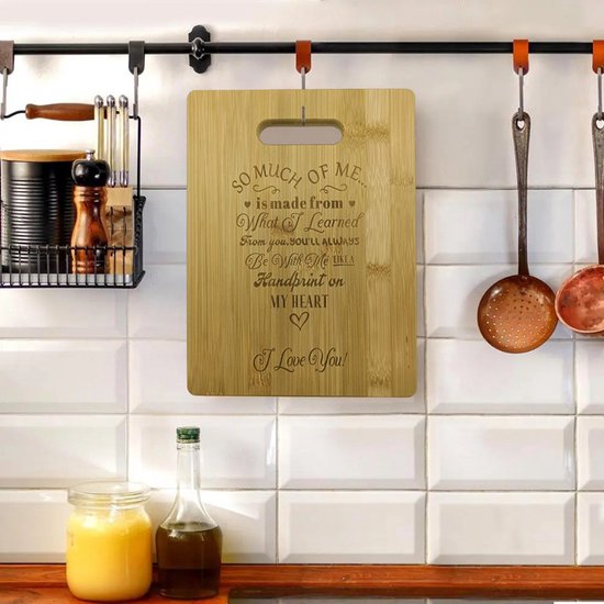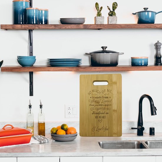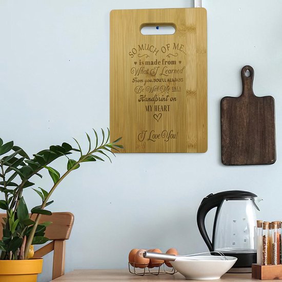 Op zoek naar een uniek en persoonlijk cadeau? Deze plank, vervaardigd uit duurzaam en milieuvriendelijk bamboe, biedt niet alleen een stevig oppervlak voor al je snijbehoeften, maar dient ook als een stijlvol serveerplank.