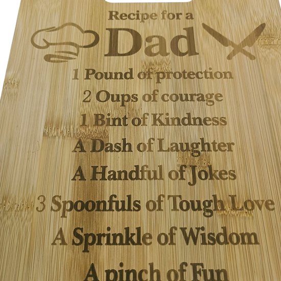 Verras een bijzondere moeder met deze multifunctionele bamboe snijplank, verfraaid met een hartverwarmend 'Recept voor een vader'. Ideaal als snijplank, serveerplank of keukendecoratie.