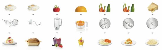blender, een molen om groente meer te snijden en raspen, een citruspers en een extra mengkom. Bovendien bewegen de unieke gardes van deze keukenmachine in drie richtingen tegelijkertijd, zodat alle ingrediënten goed worden gemengd.