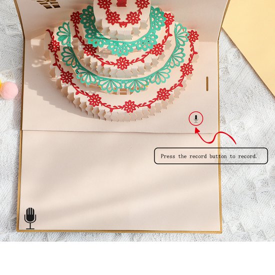 De kaart beschikt over een opnamefunctie waarmee een gepersonaliseerde wens of verjaardagslied kan worden opgenomen, waardoor de ontvanger wordt verrast en verwarmd. Daarnaast heeft de kaart ook licht- en kaarseffecten die kunnen worden bediend met een schakelaar, waardoor een warme sfeer ontstaat rond de verjaardagstaart.