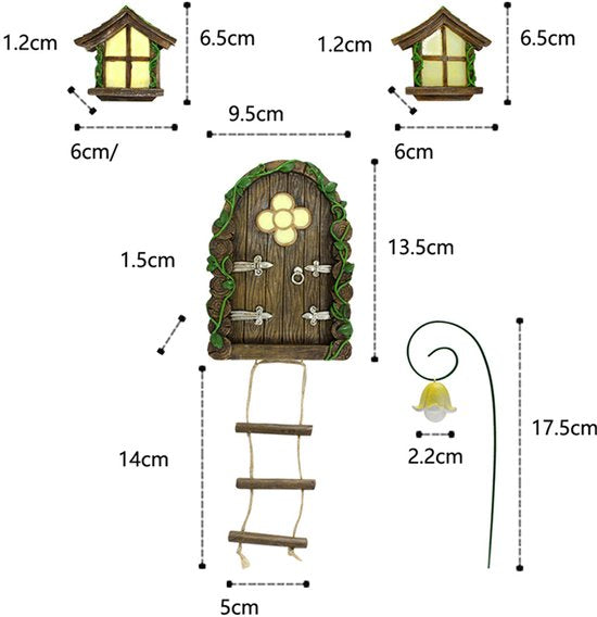 Decoratieve sprookjesdeur- en raamset met lichtgevende details voor sfeervolle tuin-, pot- en boomstamdecoratie. Handgeschilderde polystone ornamenten; totale setmaat ca. 20,5×17×5,5 cm en eenvoudig te bevestigen.