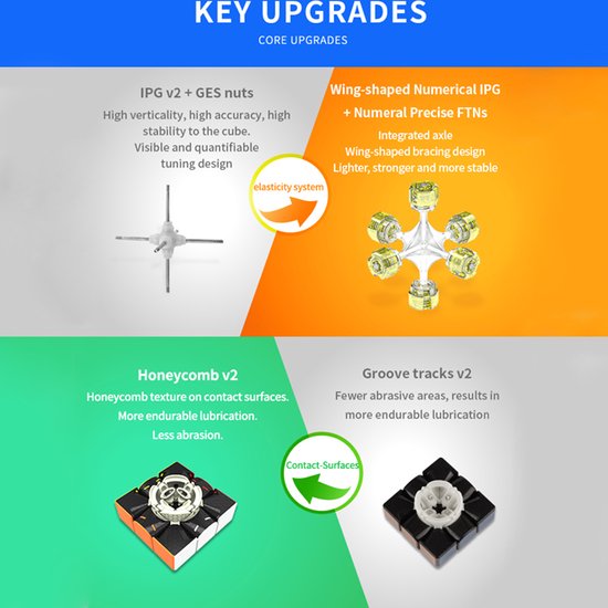 De GAN 356 RS is de opvolger van de GAN 356 R, een budget kubus van GAN. Deze kubus bevat geen magneten, maar desondanks dat draait deze kubus soepel en stabiel. In vergelijking met de GAN 356 R, bevat deze kubus GES-nuts (de gele). Ook heeft deze het welbekende honeycomb (honinggraat) design op de contactoppervlakten van de kubus, wat zorgt voor een goede verdeling van de lubricant(en) die u kunt gebruiken om de kubus te smeren. Daarnaast zorgt het ook voor het soepele draaien van de kubus. Voor beginners is deze kubus dus zeker een aanrader!