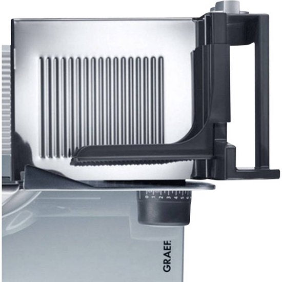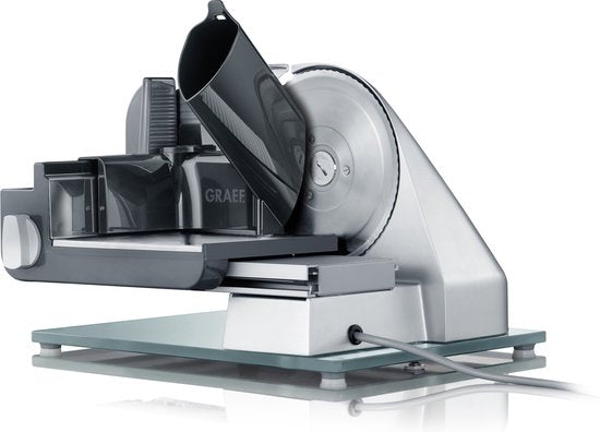 Deze snijmachine 'Classic' van Graef is een universele snijmachine waarmee je eenvoudig en snel verse vleeswaren, kaas, groenten, fruit en brood snijdt. Want wat is lekkerder dan vers gesneden brood of vleeswaren, precies op jouw favoriete dikte gesneden? Deze machine is de beste keuze wanneer de machine veelvuldig of voor zwaardere snijtaken (vette, plakkende kaas of vleeswaren) wordt gebruikt. De snijdikte is naar wens instelbaar van 0 - 20 mm door de grote draaiknop te verdraaien. Het bijgesloten combinatie-opzetstuk restenhouder en mini-slice beschermt je vingers tijdens het snijden, en de machine is voorzien van een kinderbeveiliging waarmee de slede vergrendeld kan worden wanneer deze niet gebruikt wordt. Het snijden gaat comfortabel dankzij de moment- en duurschakelaar. Deze is geïntegreerd in de slede en te gebruiken voor kort of langdurig snijden. Deze snijmachine is gemaakt uit een combinatie van metaal en kunststof, heeft een royale glazen bodemplaat en is voorzien van een kabeldepot. Dankzij de vrijdragende constructie en de afneembare slede maak je de machine na gebruik eenvoudig schoon. De machine wordt inclusief een kunststof opvangschaal en het combinatie-opzetstuk restenhouder en mini-slice geleverd. Deze snijmachine heeft een gegolfd roestvrijstalen mes; een glad mes voor deze machine is los verkrijgbaar en eenvoudig te wisselen.