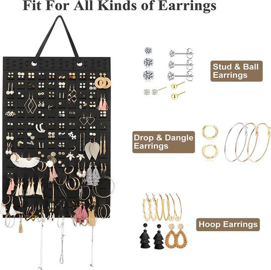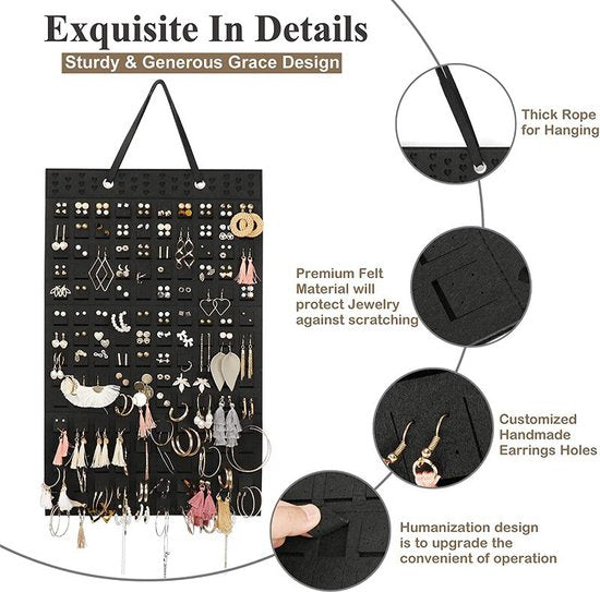 Dit sieraden opbergzakje is gemaakt van zacht vilt materiaal en heeft meerdere vakjes om verschillende soorten oorbellen en oorstekers in op te bergen. Het heeft een handige ophanghaak, zodat je het gemakkelijk aan een haak of deur kunt ophangen om ruimte te besparen.