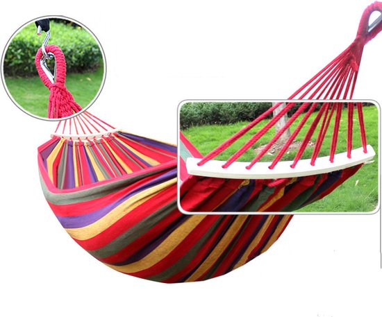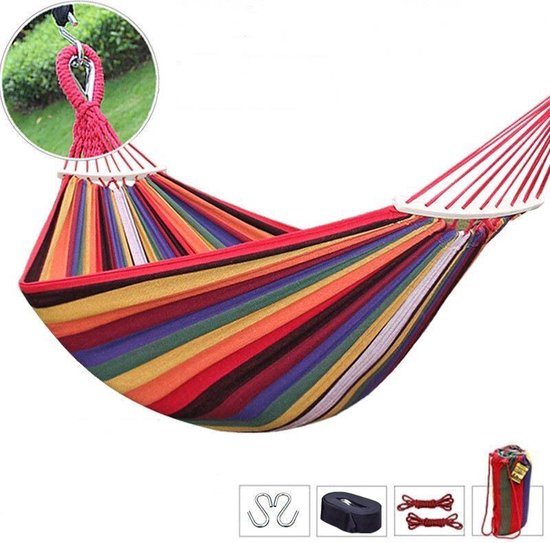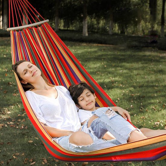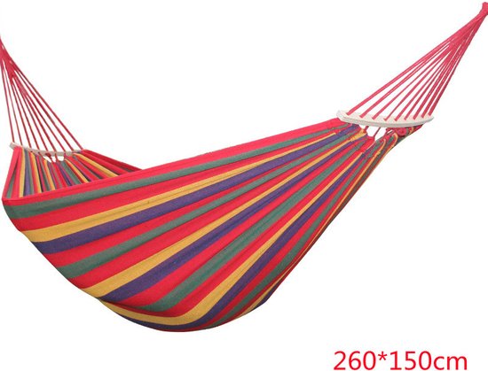 Afmetingen: De hangmat heeft een royale afmeting van 260x150 centimeter, waardoor er voldoende ruimte is om comfortabel te liggen.