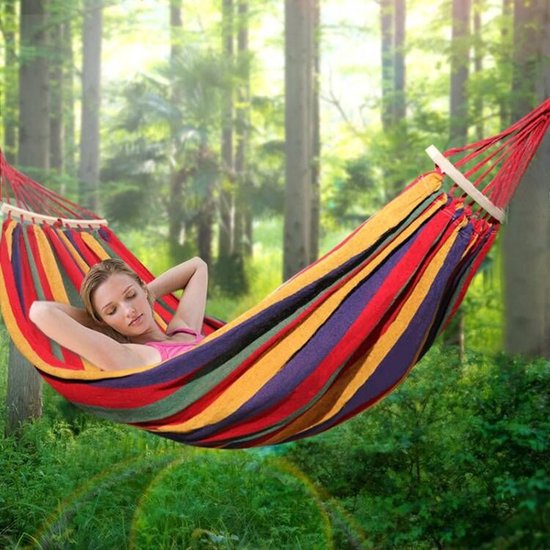 Met een draagvermogen van 300 kg is deze hangmat geschikt voor diverse buitenactiviteiten, zoals kamperen, een dagje uit of ontspanning in je slaapzaal. Laat jezelf wegzakken in de serene sfeer terwijl je geniet van het comfort en de rust die deze hangmat biedt.