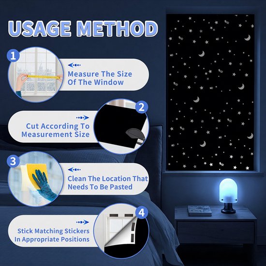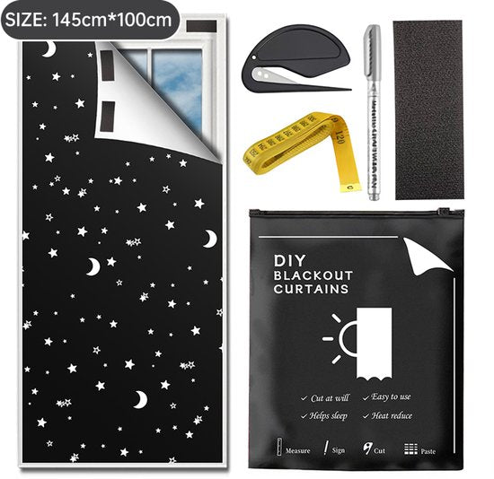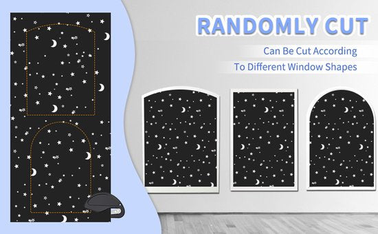 Verduisteringsdoek met sterren- en maanprint, 145 x 100 cm, knipbaar voor maatwerk. Biedt 100% verduistering en vermindert warmte en lichtinval, geleverd met snij- en bevestigingsset voor eenvoudige montage.