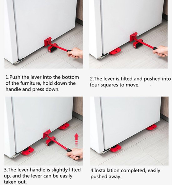 Die 4 meubelrollers kunnen onder het meubelstuk of voorwerp worden geplaatst dat verplaatst moet worden. Hiervoor wordt er op elke hoek een meubelroller geplaatst, zodat de verdeling van het gewicht gelijk wordt verdeeld.