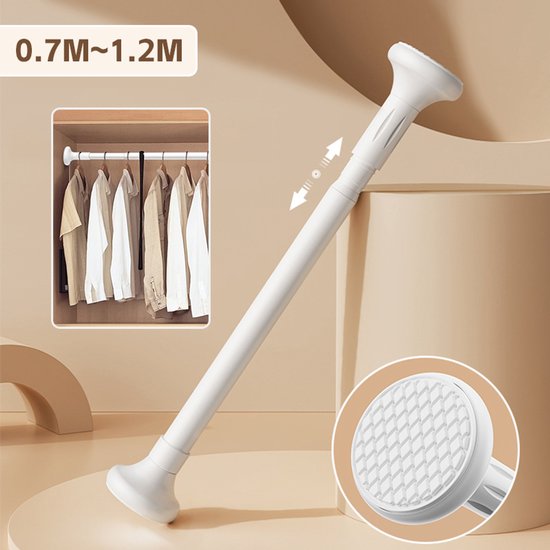 Uitschuifbare spanstang voor kleding, douchegordijn of tijdelijke opbergoplossing; eenvoudig te plaatsen zonder boren en verstelbaar van 70–120 cm. Witte aluminium buis met kunststof eindkappen en antislip pads, geschikt voor verschillende ondergronden.