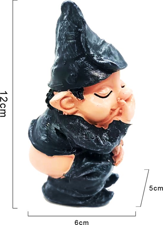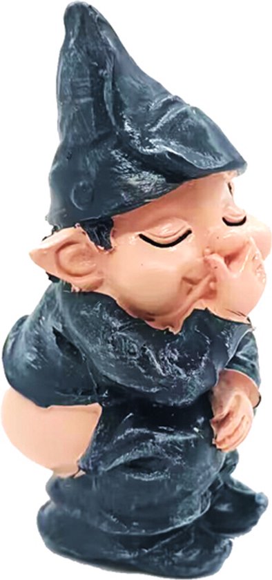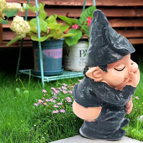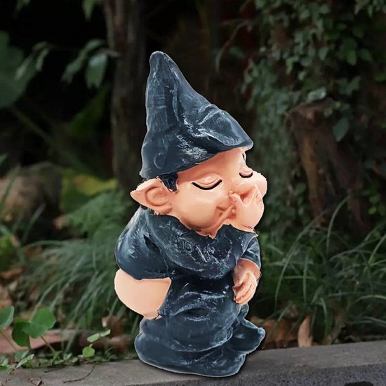 Ondeugende pose: Het kabouterbeeldje is afgebeeld terwijl het zijn behoefte doet, met een grijns op zijn gezicht, waardoor het een speels karakter krijgt.