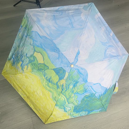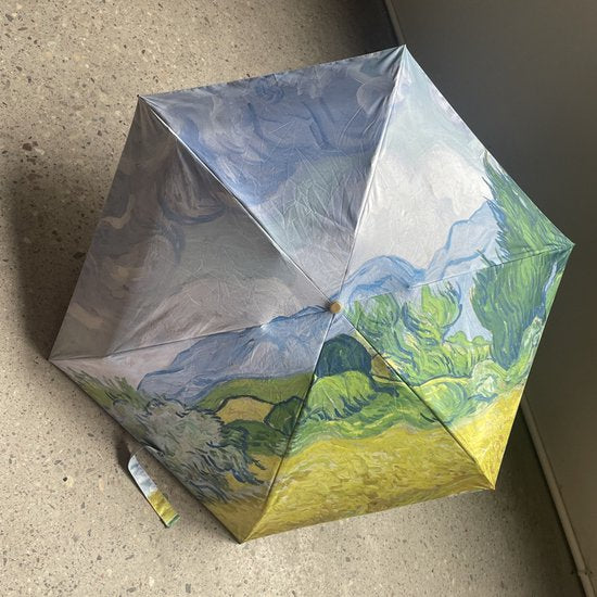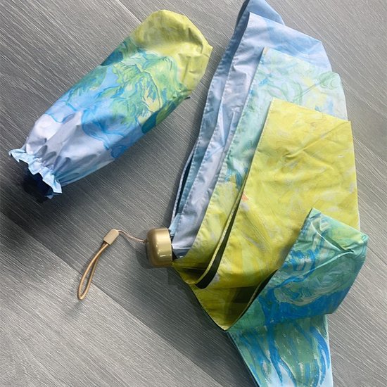 Compacte opvouwbare paraplu met kunstzinnige landschapprint en 102 cm spanwijdte; biedt UPF50+ zonbescherming en een windbestendige constructie. Vouwt 5x in tot 17 cm en past makkelijk in een handtas.