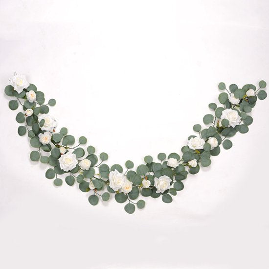 Gemaakt van hoogwaardige stoffen, straalt hij een levendige ijzige groene kleur uit en is versierd met 21 pure witte rozen. De bladeren hebben een realistisch ontwerp, vergelijkbaar met eucalyptusbladeren, en voelen natuurlijk aan.