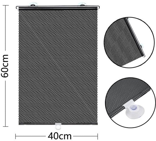 Oprolbaar auto zonnescherm dat zonlicht en warmte reduceert, formaat 40 x 60 cm in zwarte mesh-stof. Eenvoudige montage met zuignappen en clips, geschikt voor de meeste zijruiten en kleine voorruiten.