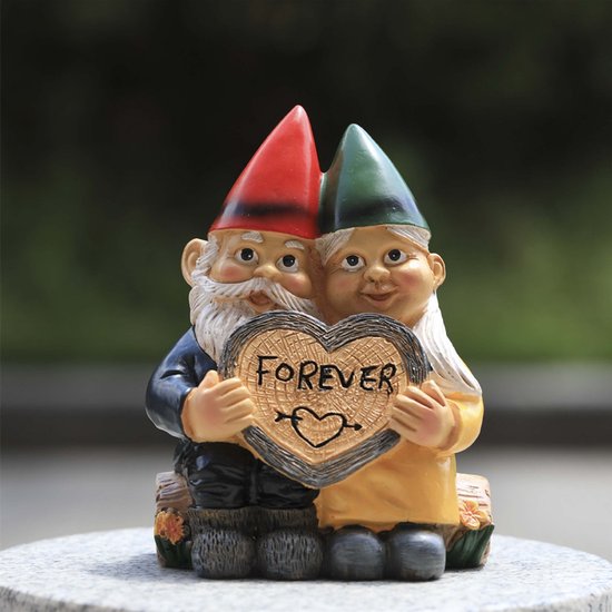 Versier uw tuin met dit charmante tuinbeeldje van een kabouterechtpaar dat een hartvormig bord met het opschrift 'FOREVER' vasthoudt. Dit beeldje is niet alleen een liefdevol symbool van eeuwige toewijding, maar ook een perfecte aanvulling voor elke tuinsetting, groot of klein.