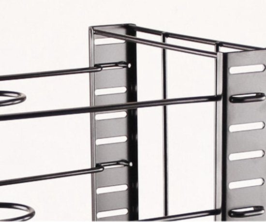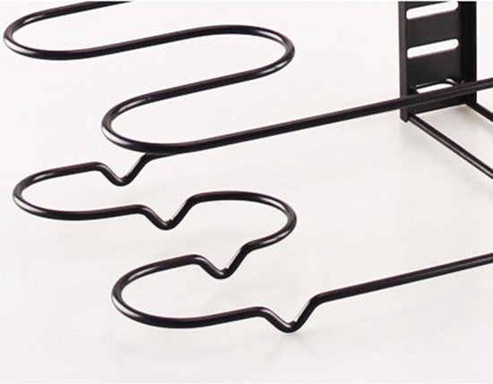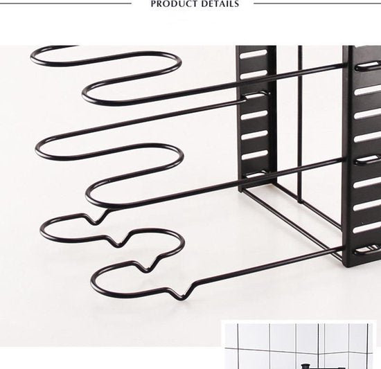 Multifunctioneel Dit pottenrek: kan horizontaal of verticaal worden geplaatst, afhankelijk van uw behoeften. Het speciale U-vormige groefontwerp kan verticaal worden gebruikt en kan de potdeksels stevig op hun plaats houden.