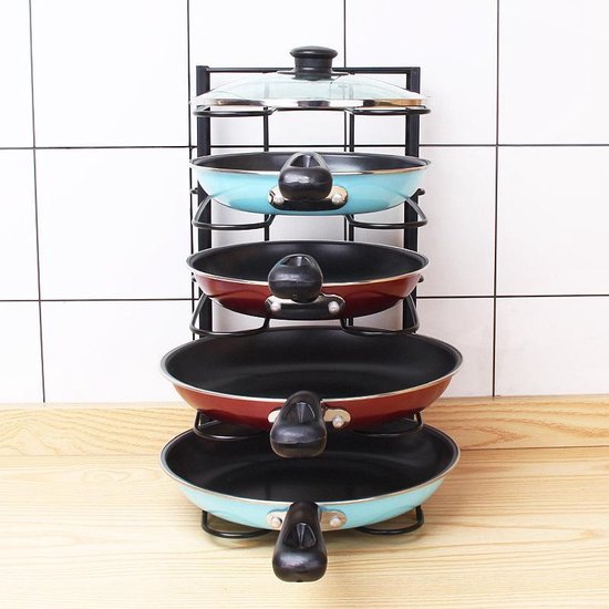 Grote opslagcapaciteit: dit in hoogte verstelbare rek is een perfecte oplossing voor het opbergen van alle potten en pannen, waardoor u veel ruimte in de keuken bespaart. Stapel moeiteloos tot wel 5 koekenpannen, sauspannen, bakplaten of potten van verschillende formaten.