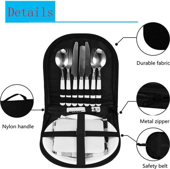 Deze kampeerservieset biedt alles wat je nodig hebt om buiten te eten met 2 personen