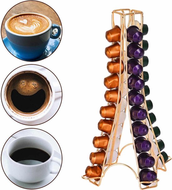 Praktische toren‑vormige houder voor het overzichtelijk opbergen van je koffiecapsules. Geschikt voor maximaal 32 Nespresso‑capsules en uitgevoerd in een goudkleurige metalen afwerking. Belangrijkste eigenschappen: - Capaciteit: 32 capsules — altijd genoeg binnen handbereik - Compatibiliteit: geschikt voor Nespresso‑style koffiecapsules - Materiaal: metalen constructie (stalen uitvoering, goudkleurig) - Afmetingen: ca. 26 x 15,4 x 17,8 cm — compact en neemt weinig aanrechtruimte in - Design: torenvormig en ruimtebesparend; past in moderne keukens Voordelen: - Houdt je capsules netjes geordend en zichtbaar zodat je snel je favoriete smaak kiest - Goudkleurige afwerking geeft een stijlvolle touch aan je keuken zonder veel ruimte te gebruiken - Eenvoudig schoon te maken: afnemen met een vochtige doek Gebruikstips: - Plaats op een vlakke ondergrond en vul per rij zodat capsules niet blokkeren - Niet geschikt voor lange opslag van geopende cups met gevoelige aroma's Kortom: een eenvoudige, elegante oplossing om Nespresso‑capsules overzichtelijk en stijlvol op te bergen.