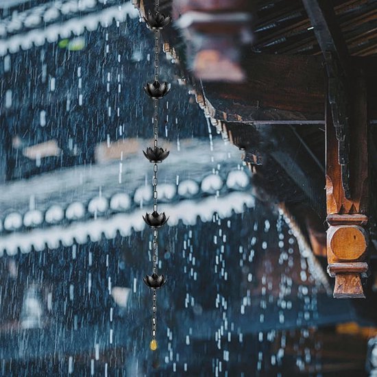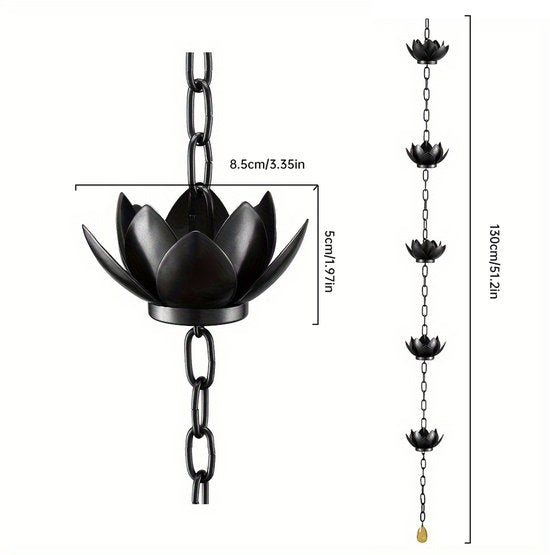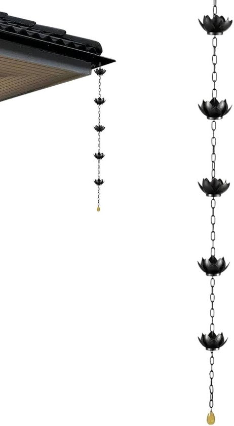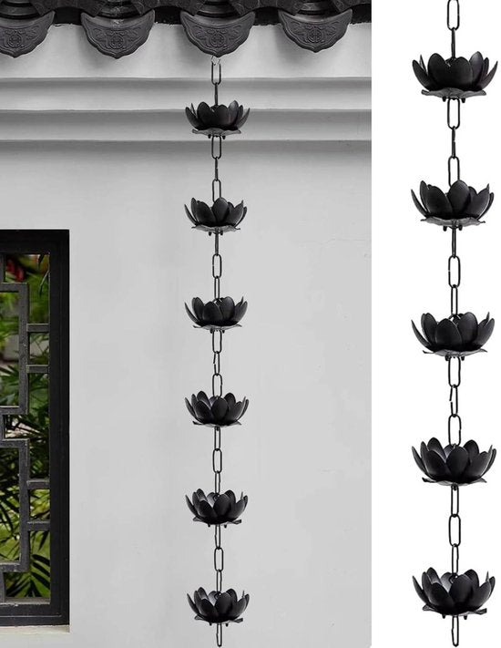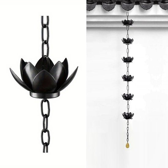 Unikorf Lotus Stijl Regenketting, een elegant en functioneel alternatief voor traditionele regenpijpen. Dit decoratieve stuk, geïnspireerd door de serene lotusbloem, combineert praktisch regenwaterbeheer met een verfijnde uitstraling. Gemaakt van duurzaam metaal met een stijlvolle zwarte afwerking, dirigeert deze regenketting regenwater op een gracieuze manier van uw dak naar de grond, terwijl het een rustgevend waterelement toevoegt aan uw tuin of terras.
