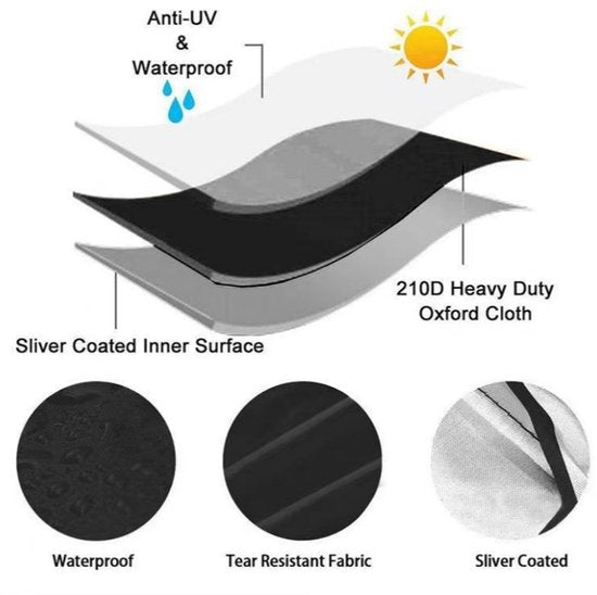 Bescherm je rolstoel of compacte scootmobiel in één handomdraai tegen regen, zon, stof én wind. De hoes is gemaakt van 210-denier Oxford-polyester met een dubbele PU-/zilvercoating. Dit textiel haalt in laboratoriumtests een hydrostatische kop van tot 3000 mm en mag dus officieel “waterdicht” heten, terwijl de metallic binnenlaag bovendien 98 % van de UV-straling reflecteert en zo verkleuring tegengaat.